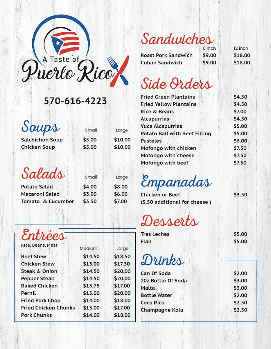 Stepping into the menu at A Taste Of Puerto Rico Menu feels a bit like wandering into a warm kitchen where someone’s been cooking all day. Located at 734 Main St in Honesdale, this spot brings out the kind of dishes that make you slow down and savor what’s in front of you. As you look through the options, you’ll notice familiar comfort foods alongside bolder island flavors, all carrying that home-style feel Puerto Rican cooking is known for.